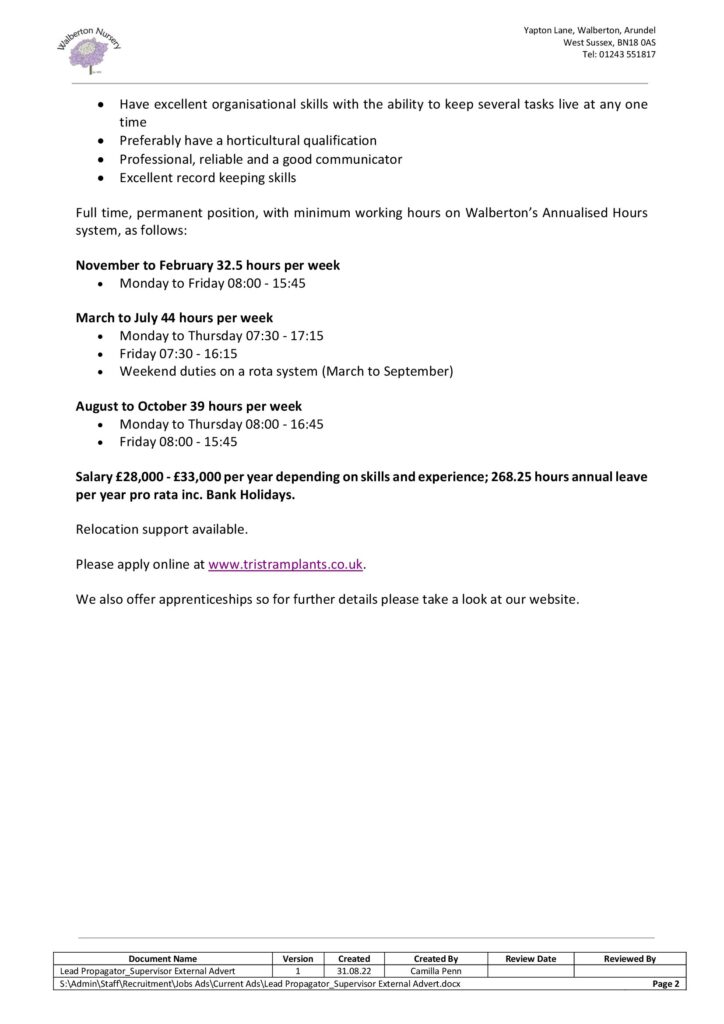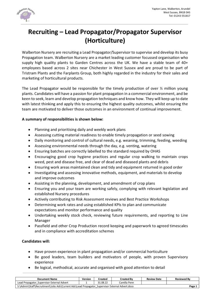 Walberton Nursery are recruiting a Lead Propagator/Supervisor to supervise and develop its busy Propagation team. Walberton Nursery are a market leading customer focussed organisation who supply high quality plants to Garden Centres across the UK. We have a stable team of 40+ employees based across 2 sites near Chichester in West Sussex and are proud to be part of Tristram Plants and the Farplants Group, both highly regarded in the industry for their sales and marketing of horticultural products.